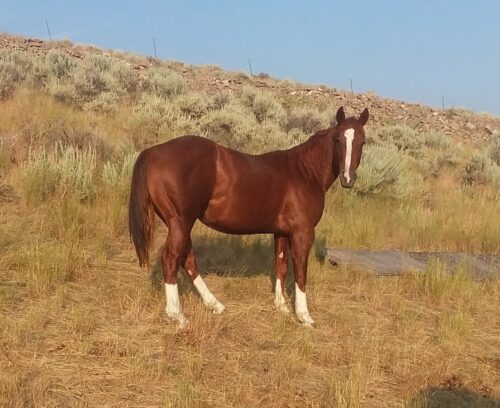 14’3″ 1100# Chestnut Mare with a white blaze and 2 white socks